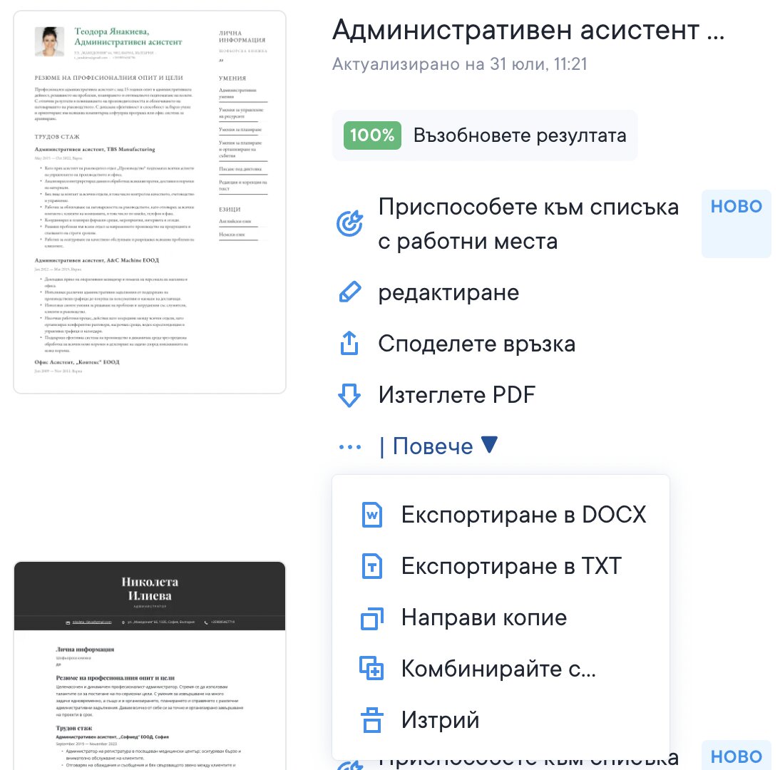 При натискане на бутона „…“ се появява стандартно падащо меню, което предлага няколко начина за изтегляне на твоето CV:
