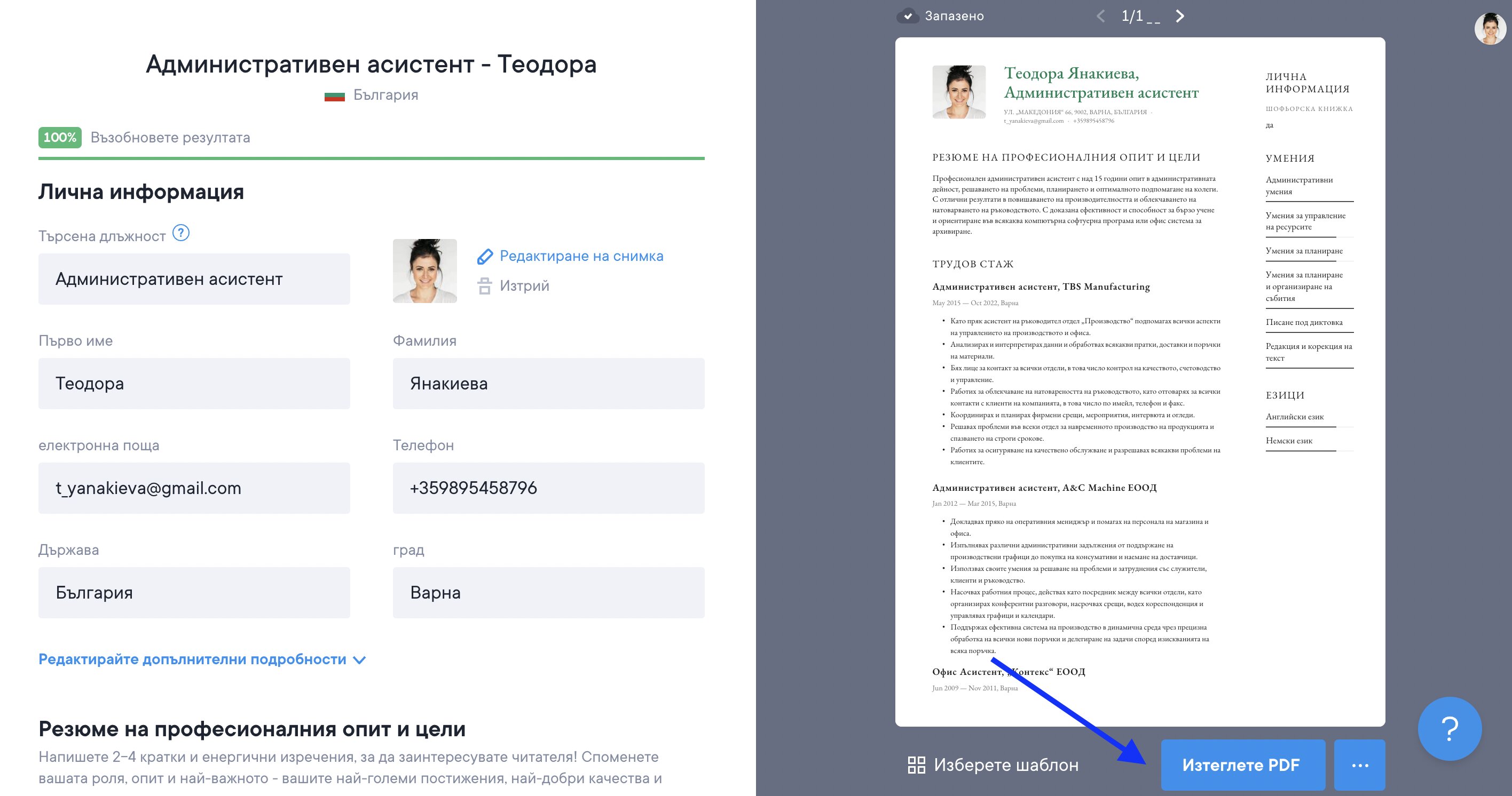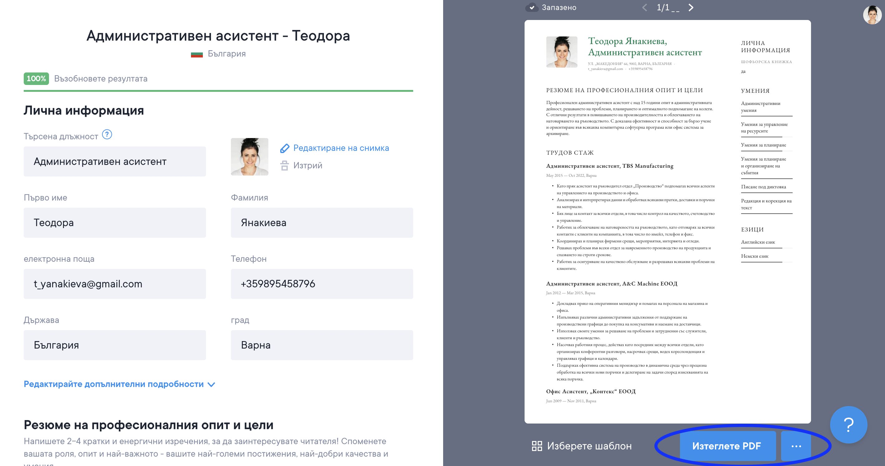 Винаги имаш 3 опции за изтегляне на твоето CV: в TXT (безплатно), PDF или DOCX файл. Твоето CV ще изглежда еднакво, независимо коя опция за изтегляне си избрал/а, с изключение на TXT.