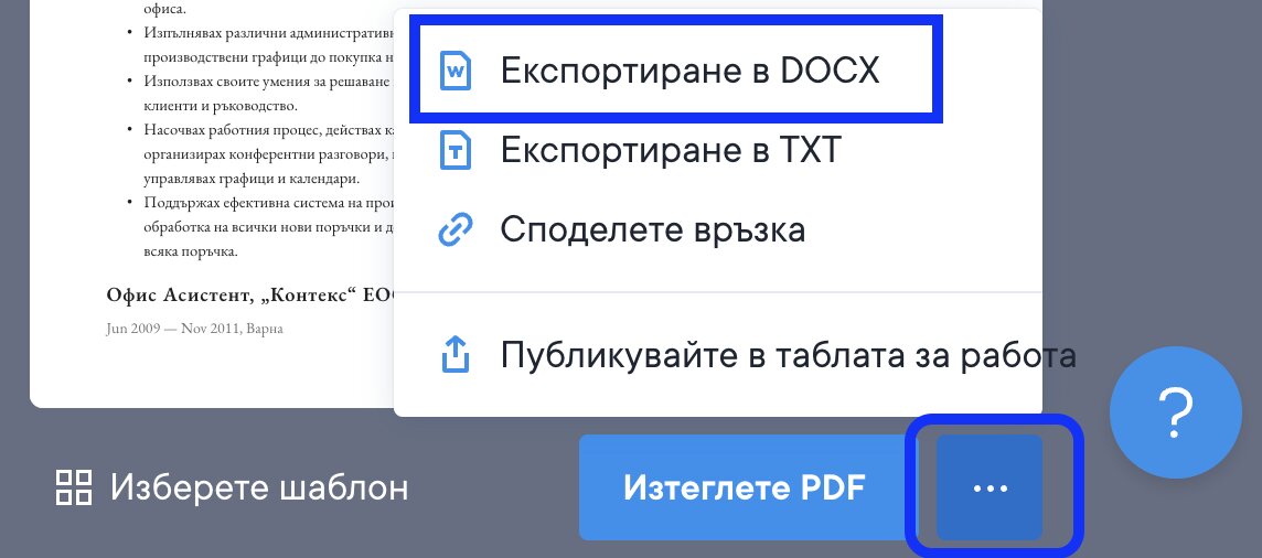 Вече сме пуснали бета версия на функцията за изтегляне на CV във формат DOCX. След като приключим с изпитването, актуализацията ще бъде налична за всички наши потребители. Това е премиум функция, която може да бъде полезна в някои държави, където работодателите изискват документ в Word вместо PDF файл. Ще намериш тази страхотна функция, като натиснеш върху „…“ до бутона за изтегляне в приложението (виж по-долу).