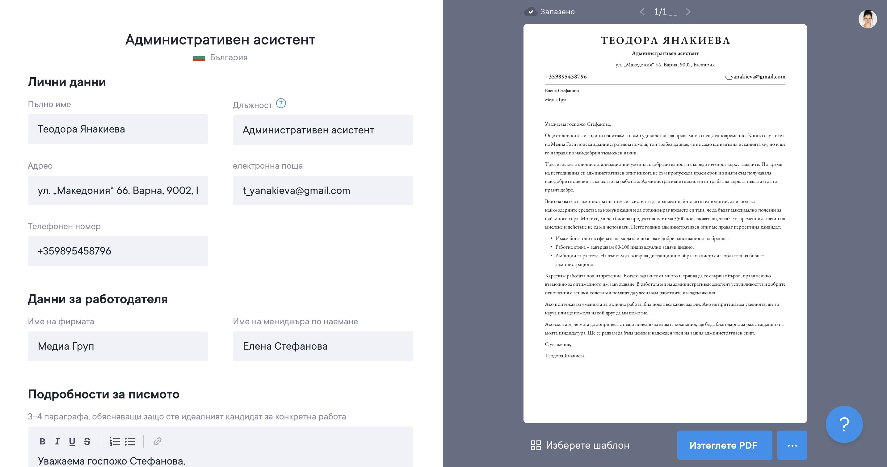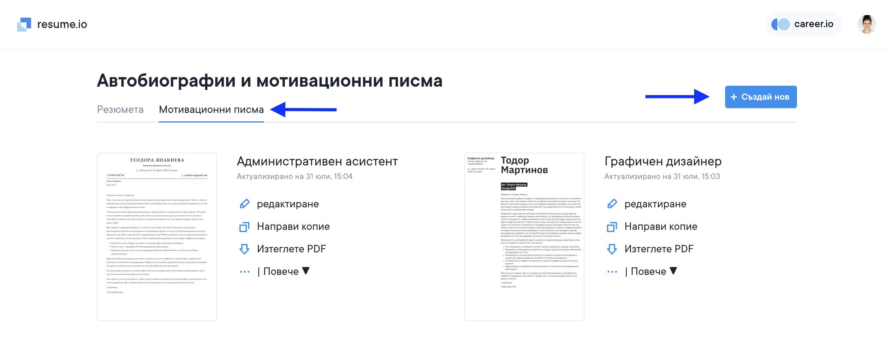 Можеш да ползваш CVapp.bg за безплатно създаване, изтегляне и споделяне на мотивационни писма. Всеки шаблон за CV има съответстващ такъв за мотивационно писмо, което можеш да изпращаш заедно с автобиографията си. Ще получиш неограничен достъп до шаблони за мотивационни писма, цветови схеми по избор и опция за изтегляне на PDF. Дори можеш да обединиш CV-то и мотивационното си писмо в един документ за удобство на всички участници в процеса по подбор на персонал и назначаване. Тази нова функция се намира в падащото меню под „Още“ от дясната страна на прозореца за общ преглед на твоето CV/мотивационно писмо. След това просто избери кои два документа да обединиш и готово! Виж следващата снимка на екран.