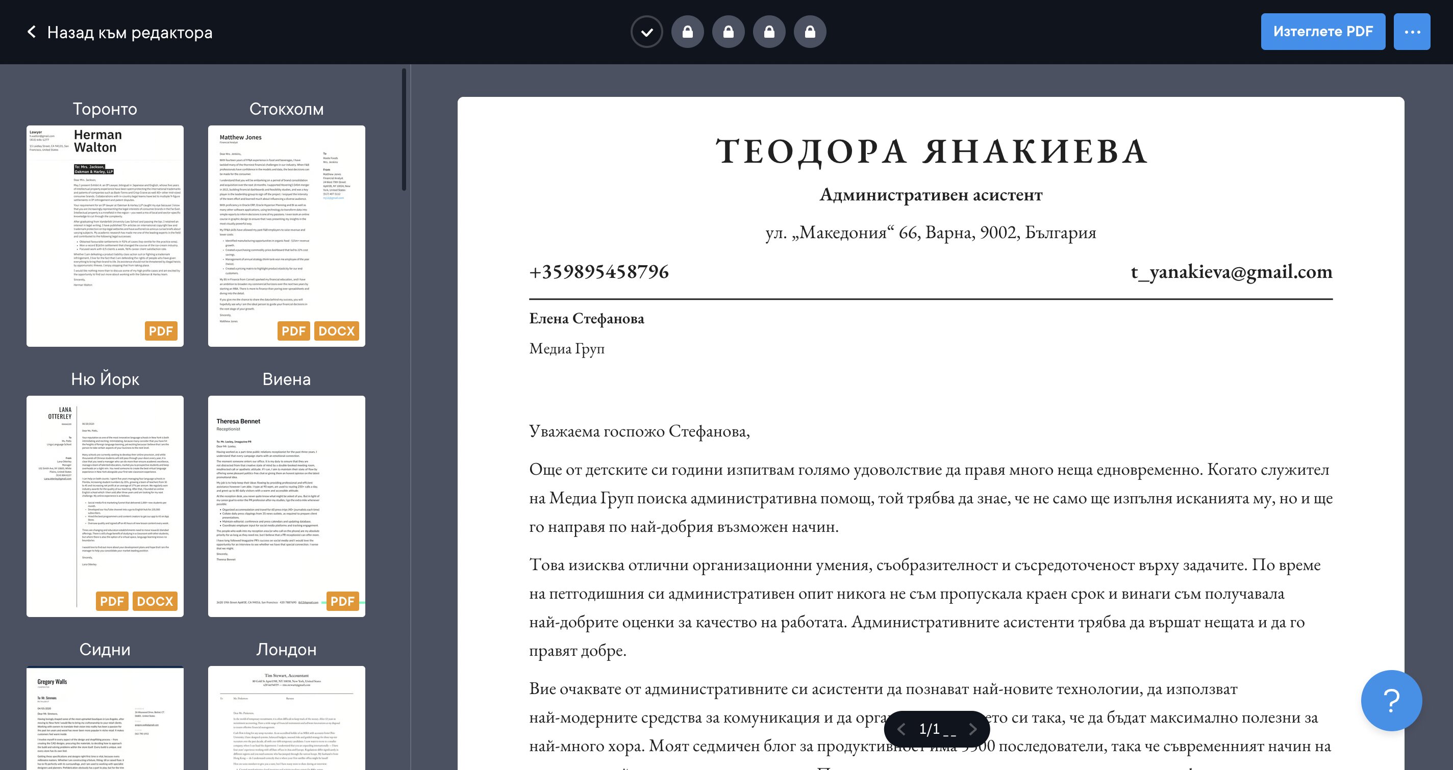 Стъпка 4: Можеш да избереш оформлението, което искаш да използваш, и да изтеглиш мотивационното си писмо безплатно, щом си готов/а. Можеш да изтеглиш мотивационното си писмо като отделен PDF файл или да го обединиш със CV-то си. Ако изпращаш мотивационното си писмо заедно със CV-то си, препоръчваме да ползваш едно и също оформление, така че двата документа да си подхождат. Виж снимката на екран по-долу.