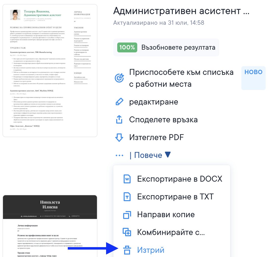 Можеш да изтриеш мотивационно писмо, като влезеш в таблото за мотивационни писма и натиснеш „Изтрий“. Изтриването на мотивационното писмо е окончателно. Нашият екип не може да възстановява изтрити писма. Виж снимката на екран по-долу.