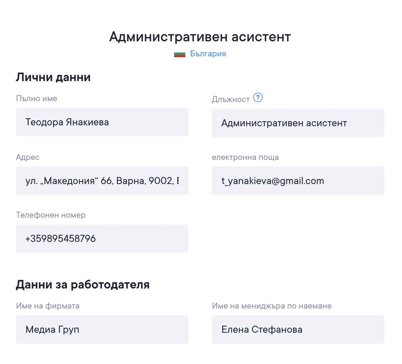 В раздел „Данни за работодателя“ за всяко мотивационно писмо можеш да добавиш конкретни данни за компанията, например име на компанията или на назначаващия, ако го знаеш. В противен случай остави този раздел празен.